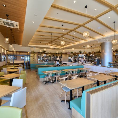 【テラス席もあり、リゾート感溢れる店内】ホテルの様な雰囲気で非日常を演出。普段とは違ったお食事時間をお楽しみいただけます。お気軽にランチ利用はもちろん、大切な方とのお食事にもぴったりなお店です。リーズナブルながらもワンランク上のビュッフェをお楽しみください。